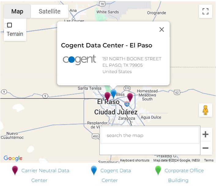 Cogent has other On-Net buildings throughout Texas; including Austin, Dallas, Fort Worth, Houston, McAllen, San Antonio, and Amarillo. As well as the nearby Phoenix and Albuquerque areas. This includes office buildings and other data centers.